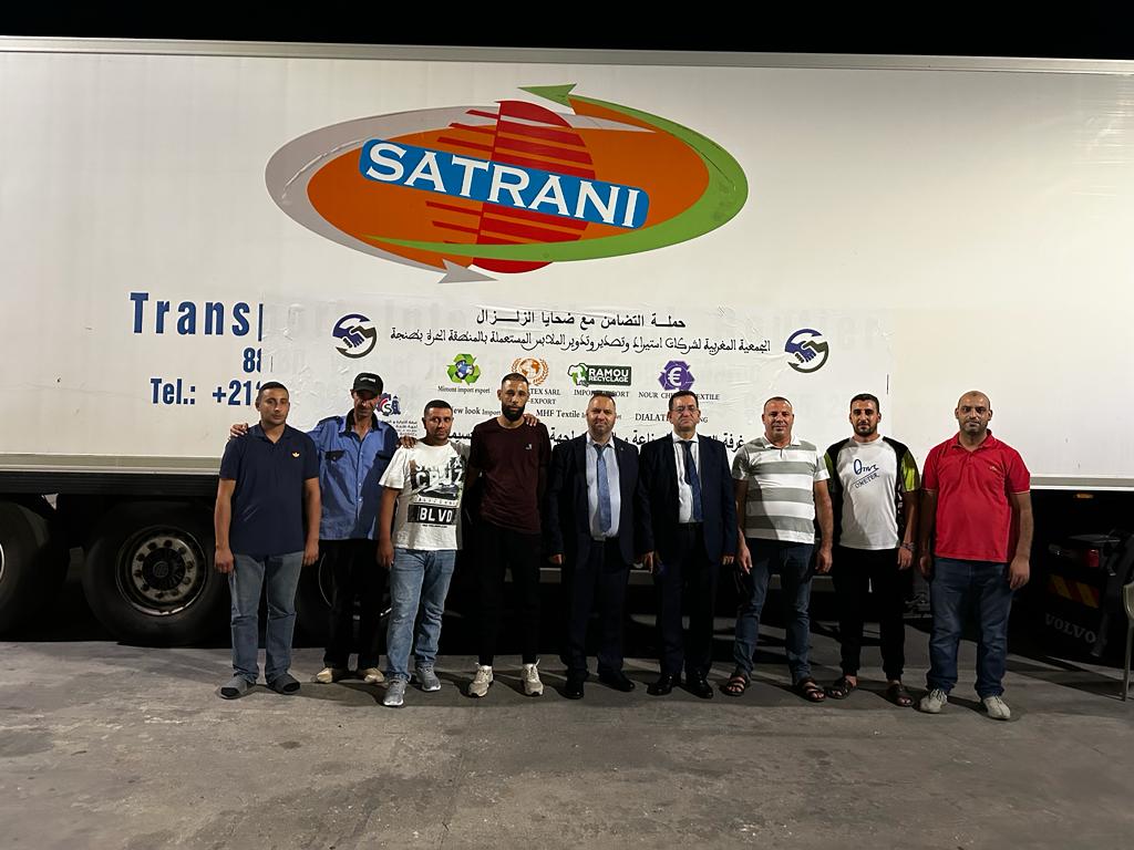 و في سياق خطة العمل التي تبناها مكتب غرفة التجارة والصناعة والخدمات لجهة طنجة تطوان الحسيمة تم يوم 15 شتنبر 2023، تنظيم قافلة تضامنية بشراكة مع الجمعية المغربية لشركات استيراد وتصدير وتدوير الملابس المستعملة بالمنطقة الحرة بطنجة عبارة عن شاحنتين محملتين ب 40 طنا من الملابس المختلفة. إضافة لشاحنة محملة ب 500 من الصفائح الخشبية بتنسيق مع الجمعية المغربية لصناعات النسيج و الألبسة-الشمال لفائدة ساكنة مناطق القرى المتضررة بإقليم تارودانت.