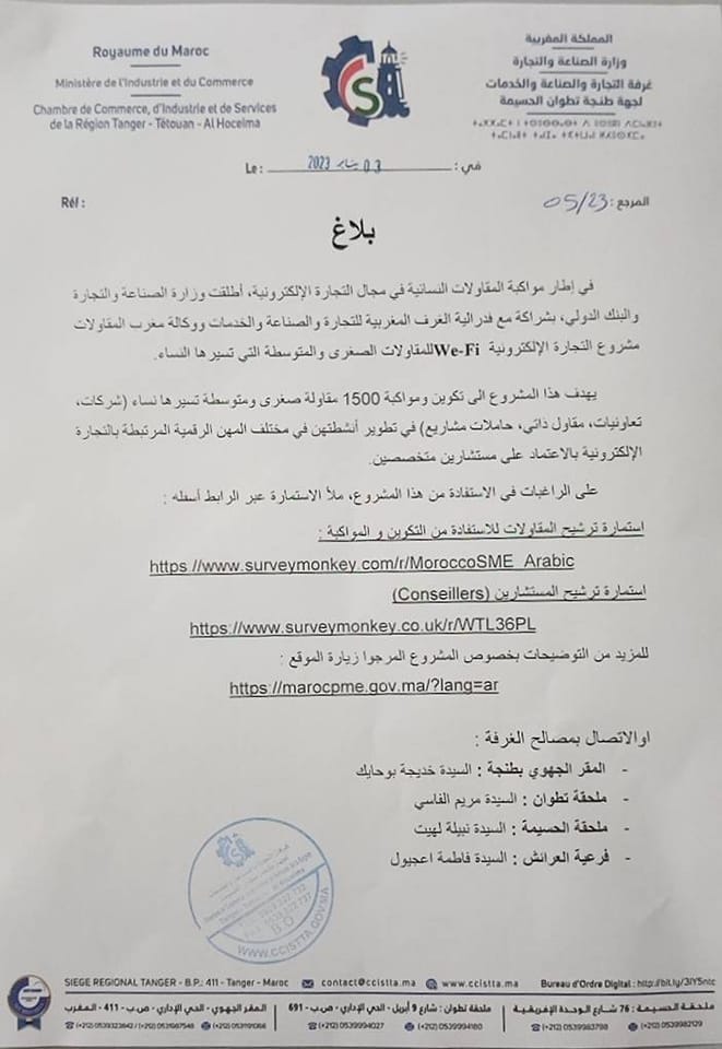 في إطار مواكبة المقاولات النسائية في مجال التجارة الإلكترونية، أطلقت وزارة الصناعة والتجارة والبنك الدولي، بشراكة مع فدرالية الغرف المغربية للتجارة والصناعة والخدمات ووكالة مغرب المقاولات مشروع التجارة الإلكترونية We-Fiللمقاولات الصغرى والمتوسطة التي تسيرها النساء.