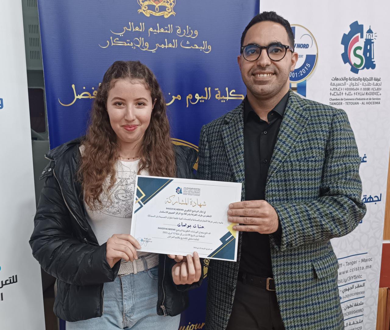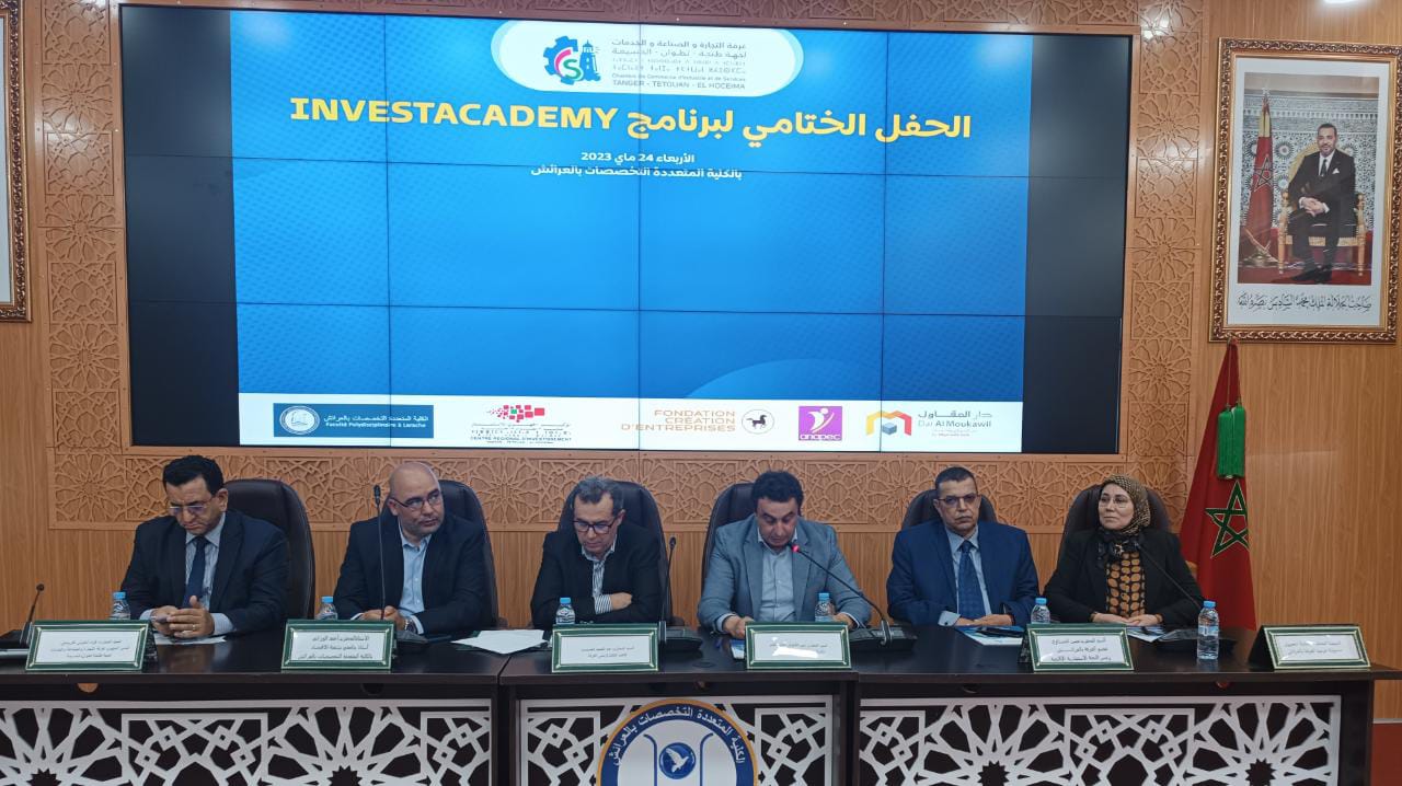 نظمت غرفة التجارة والصناعة والخدمات لجهة طنجة تطوان-الحسيمة-بفرعية العرائش يوم الاربعاء 24 ماي 2023 على الساعة الثالثة زوالا حفلا ختاميا للبرنامج التكويني INVESTACADEMY وذلك في رحاب الكلية المتعددة التخصصات بالعرائش ومن داخل قاعة AUDITORIUM التي احتضنت الحفل الختامي. ويدخل هذا البرنامج في إطار الشراكة التي جمعت الغرفة بكل من المركز الجهوي للاستثمار لجهة طنجة تطوان الحسيمة، و دار المقاول التابع للتجاري-وفابنك، والوكالة الوطنية لإنعاش التشغيل والكفاءات (أنابيك).