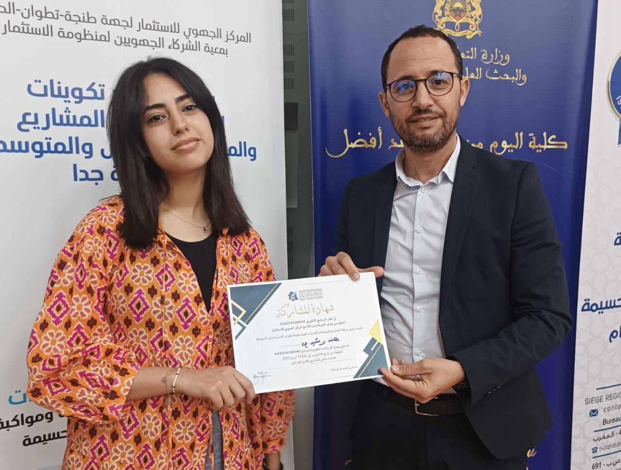 وقد عرف الحفل توزيع شهادات شكر وتقدير على جميع مؤطري البرنامج التكويني /انفست أكاديمي/ على مساهماتهم ومجهوداتهم المبذولة طوال فترة البرنامج التكويني الذي امتد من بداية شهر مارس الى غاية نهاية شهر أبريل 2023.