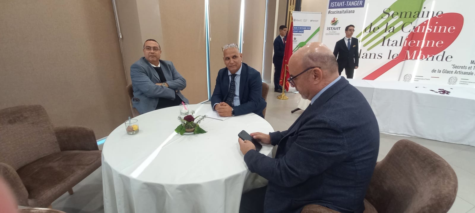 و في المساء تمت دعوة الغرفة الجهوية من طرف الوكالة الإيطالية للمشاركة في حفل توزيع شواهد المشاركة على طلبة معهد مهن الفندقة المستفيدين من تكوين “ماستر كلاس” في مجال الصناعة التقليدية للمثلجات الإيطالية، و المنظم في إطار “أسبوع المطبخ الإيطالي” حيث مثل الغرفة الجهوية في هذا الحفل السيد ياسين العرود رئيس اللجنة الاستشارية الإقليمية لشؤون المهنيين بعمالة طنجة اصيلة و إقليم الفحص انجرة.