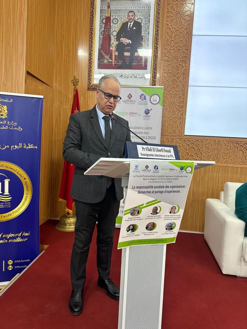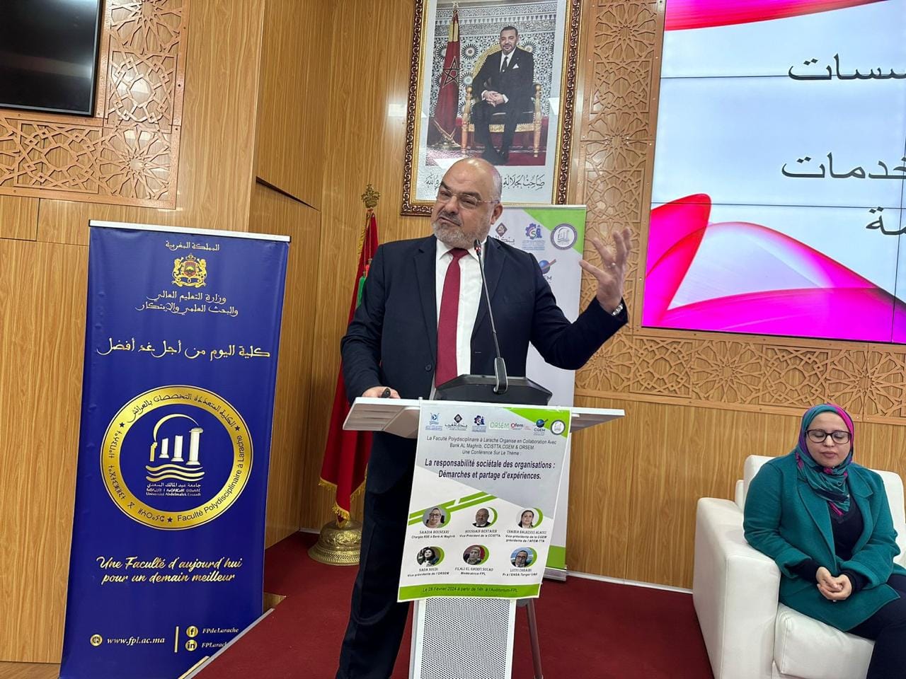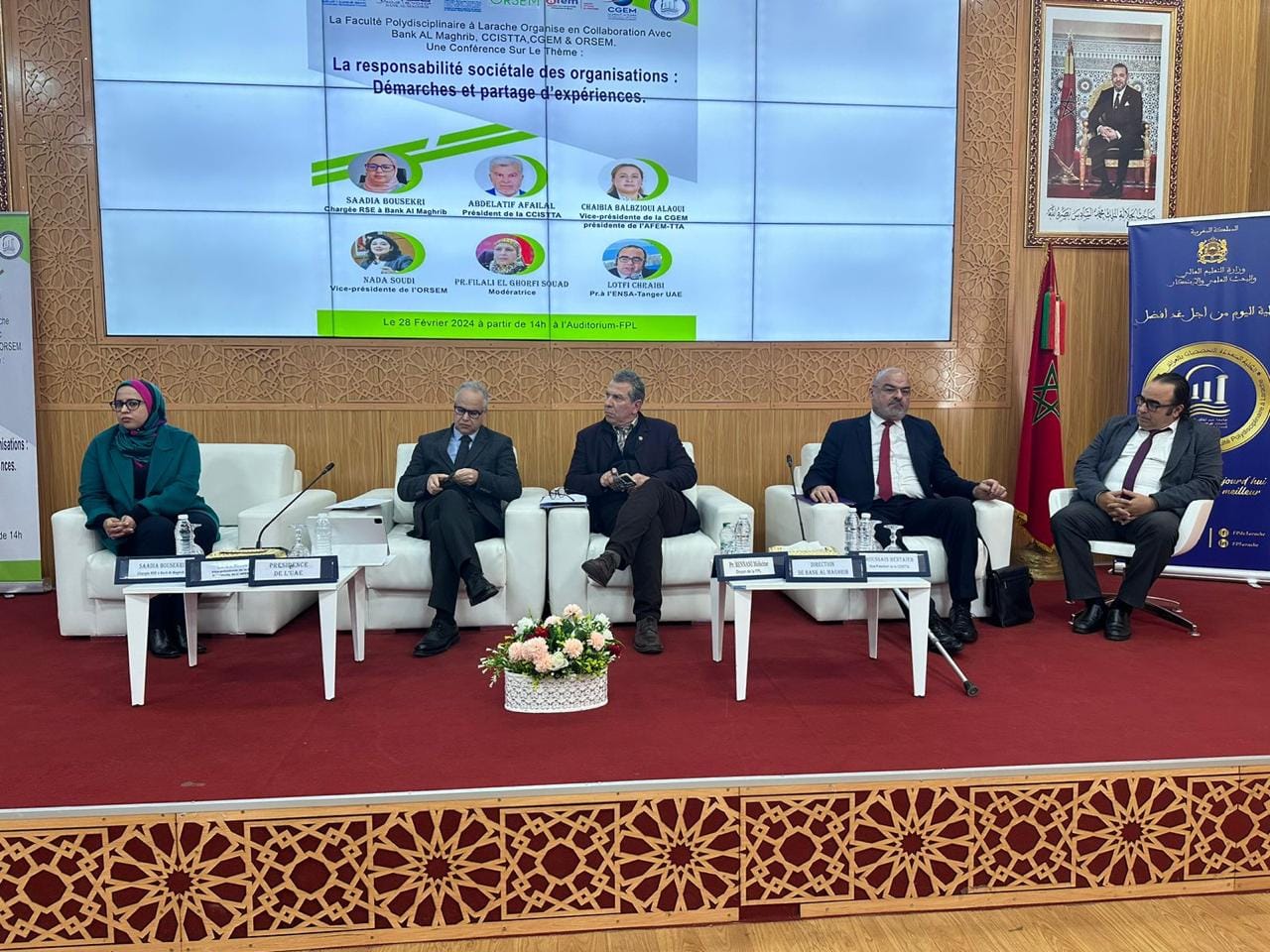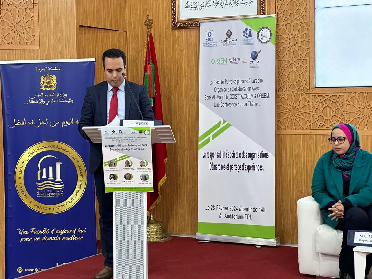و بعد الكلمات الافتتاحية لكل من نائب رئيس جامعة عبد المالك السعدي و عميد الكلية و ممثل بنك المغرب بالعرائش، فتح المجال لتقديم عروض المشاركين في اللقاء، حيث عرفت هذه الجلسة مداخلات كل من السيدة السعدية بوسكري ممثلة بنك المغرب و السيد الحسين بن الطيب عن الغرفة الجهوية و السيدة غيثة بنزاكور عن الاتحاد العام لمقاولات المغرب و السيدة ندى السودي عن مرصد المسؤولية المجتمعية و البيئية للمقاولات بالمغرب و الدكتور لطفي الشرايبي مسؤول مشروع المسؤولية المجتمعية للجامعة بالمدرسة الوطنية العليا للعلوم التطبيقية.