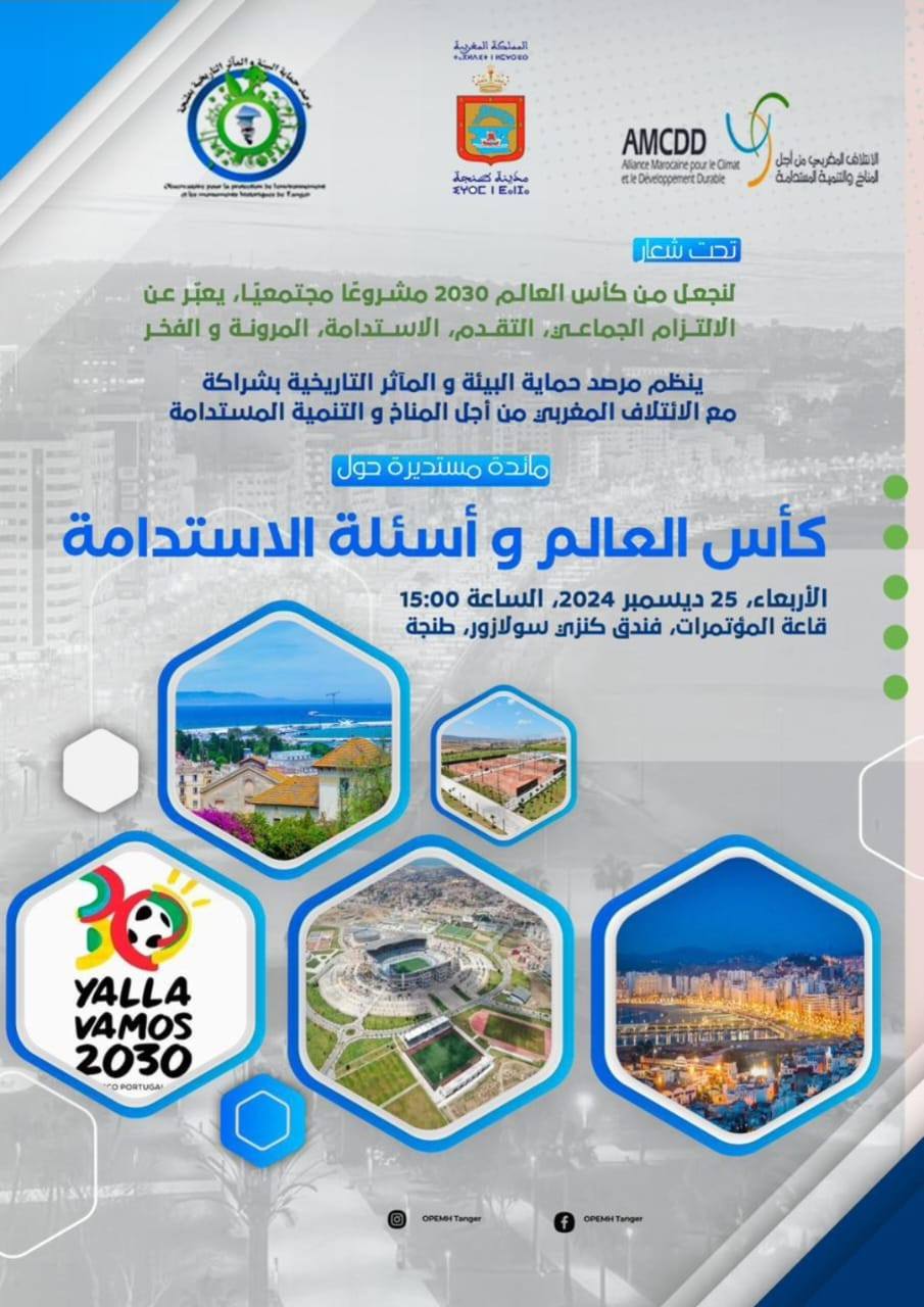 في إطار مواكبة المشاريع الهيكلية الكبرى، شاركت غرفة التجارة و الصناعة و الخدمات في مائدة مستديرة منظمة يومه الأربعاء 25 دجنبر 2024 من طرف مرصد حماية البيئة و المآثر التاريخية بطنجة بتنسيق مع الائتلاف المغربي من أجل المناخ و التنمية المستدامة و جماعة طنجة، حول موضوع: “كأس العالم 2030 و أسئلة الاستدامة”.