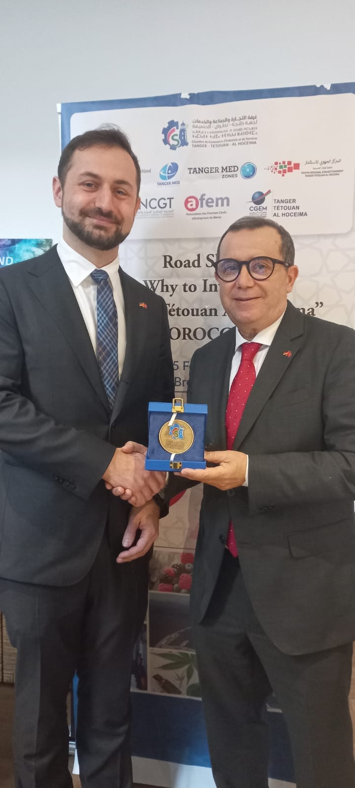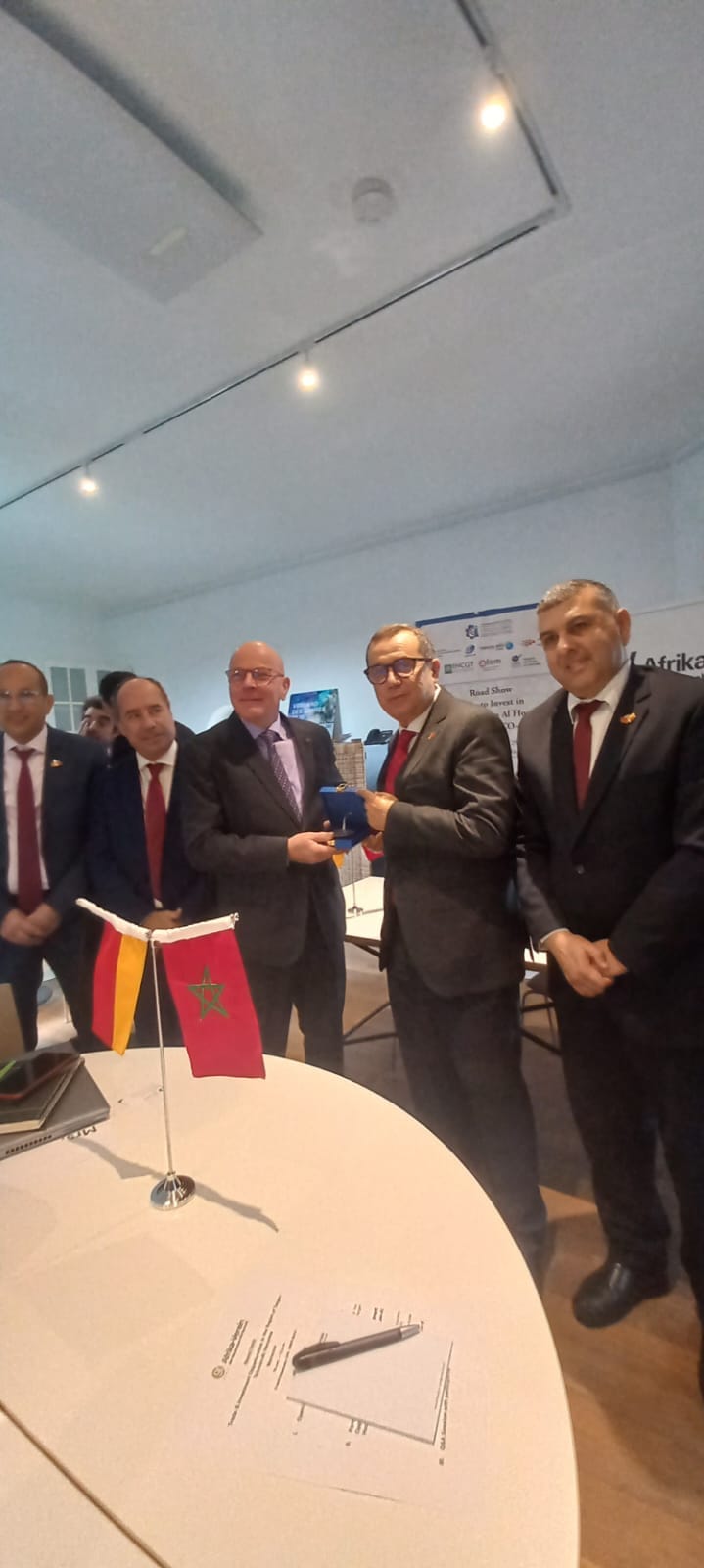 و في نهاية اللقاء قدم السيد عبد الحميد الحسيسن دروعا تذكارية للسيد Christoph Kannengiesser رئيس الجمعية الاقتصادية الألمانية المغربية و السيد Pawel Voronin ممثل وزارة الخارجية الألمانية المكلف بالعلاقات مع المغرب.