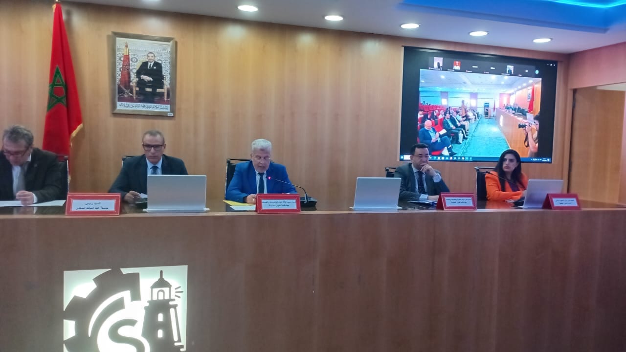 في مستهل كلمته اشاد السيد عبد اللطيف افيلال رئيس غرفة التجارة والصناعة والخدمات لجهة طنجة تطوان الحسيمة بالشراكة المتميزة التي تجمع الغرفة والجامعة كما نوه بما تقوم به الجامعة من عمل بناء في شتى المجالات بما في ذلك ابحاث التنمية المستدامة كما ذكر بالمحاور التي تتدخل فيها الغرفة في هذا الاطار كمشروع ريبوت المتوسطي ومختلف التكوينات التي انجزتها الغرفة لفائدة منتسبيها في مجال النجاعة الطاقة والملتقيات التي تنظمها في مجال الاقتصاد الأزرق و انخراط الغرفة في الحفاظ على الطاقة النظيفة عبر الالواح الشمسية بمختلف مقراتها على مستوى الجهة…