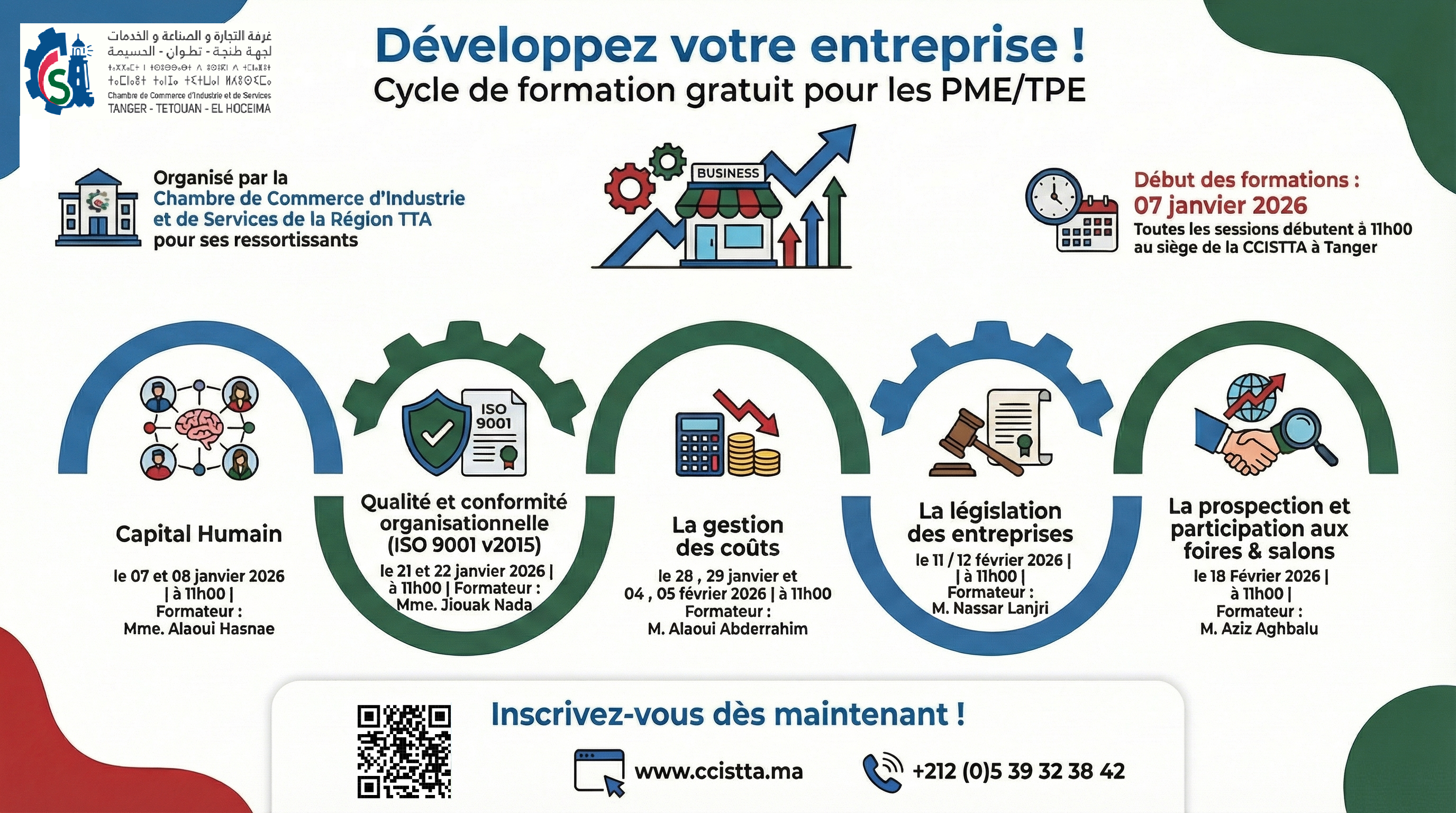 Lancement d’un cycle de formation au profit des TPE/PME (Janvier–février) La Chambre de Commerce, d’Industrie et de Services de Tanger-Tétouan-Al Hoceima (CCISTTA) annonce le lancement d’un cycle de formation au profit des petites et moyennes entreprises (PME), visant à renforcer les compétences managériales et opérationnelles des entreprises de la région. Conçu dans une logique pratique et orientée […]