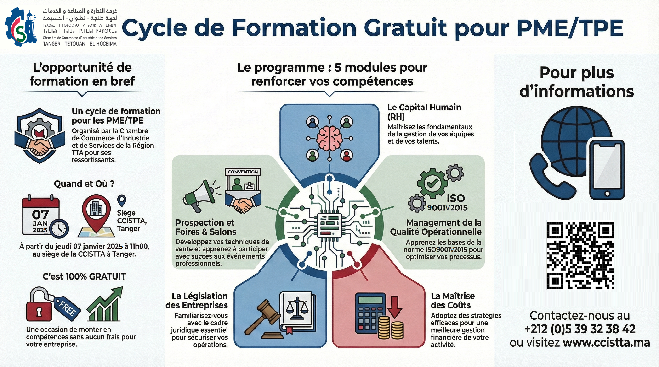 Lancement d’un cycle de formation au profit des TPE/PME (Janvier–février) La Chambre de Commerce, d’Industrie et de Services de Tanger-Tétouan-Al Hoceima (CCISTTA) annonce le lancement d’un cycle de formation